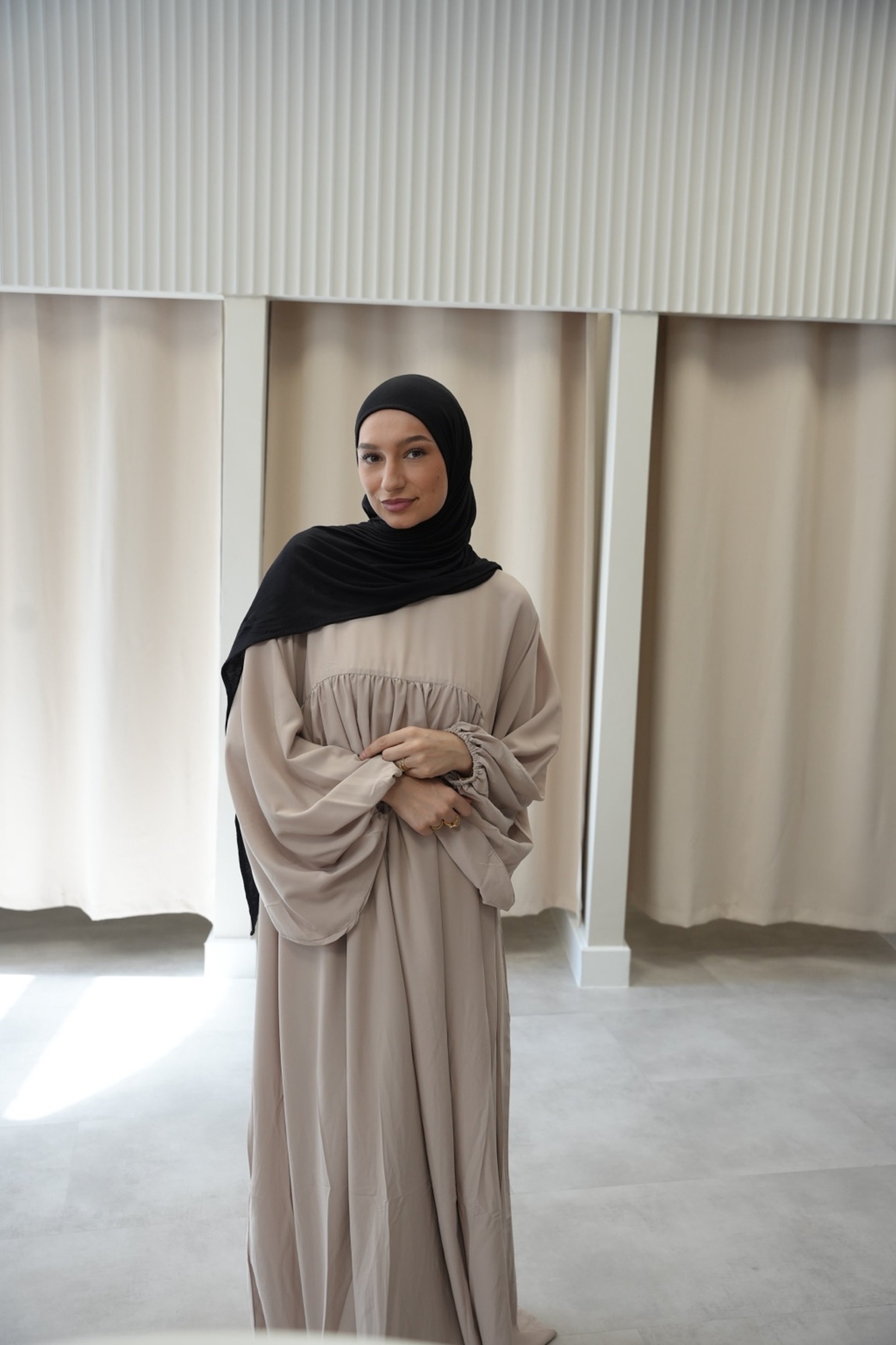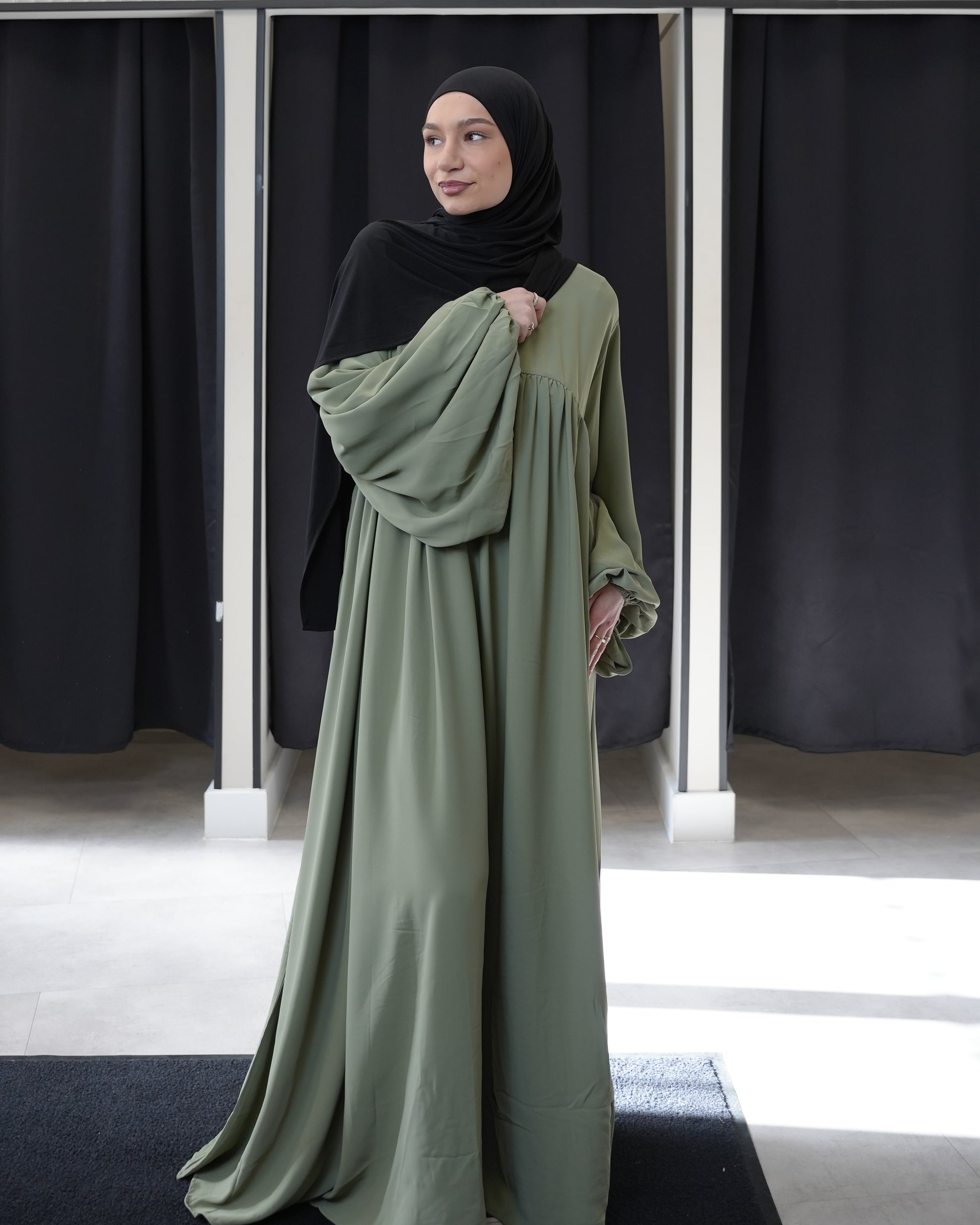 Hergestellt aus hochwertiger Medina-Seide, ist diese Abaya ein unverzichtbares Kleidungsstück im Kleiderschrank jeder modebewussten Muslima.