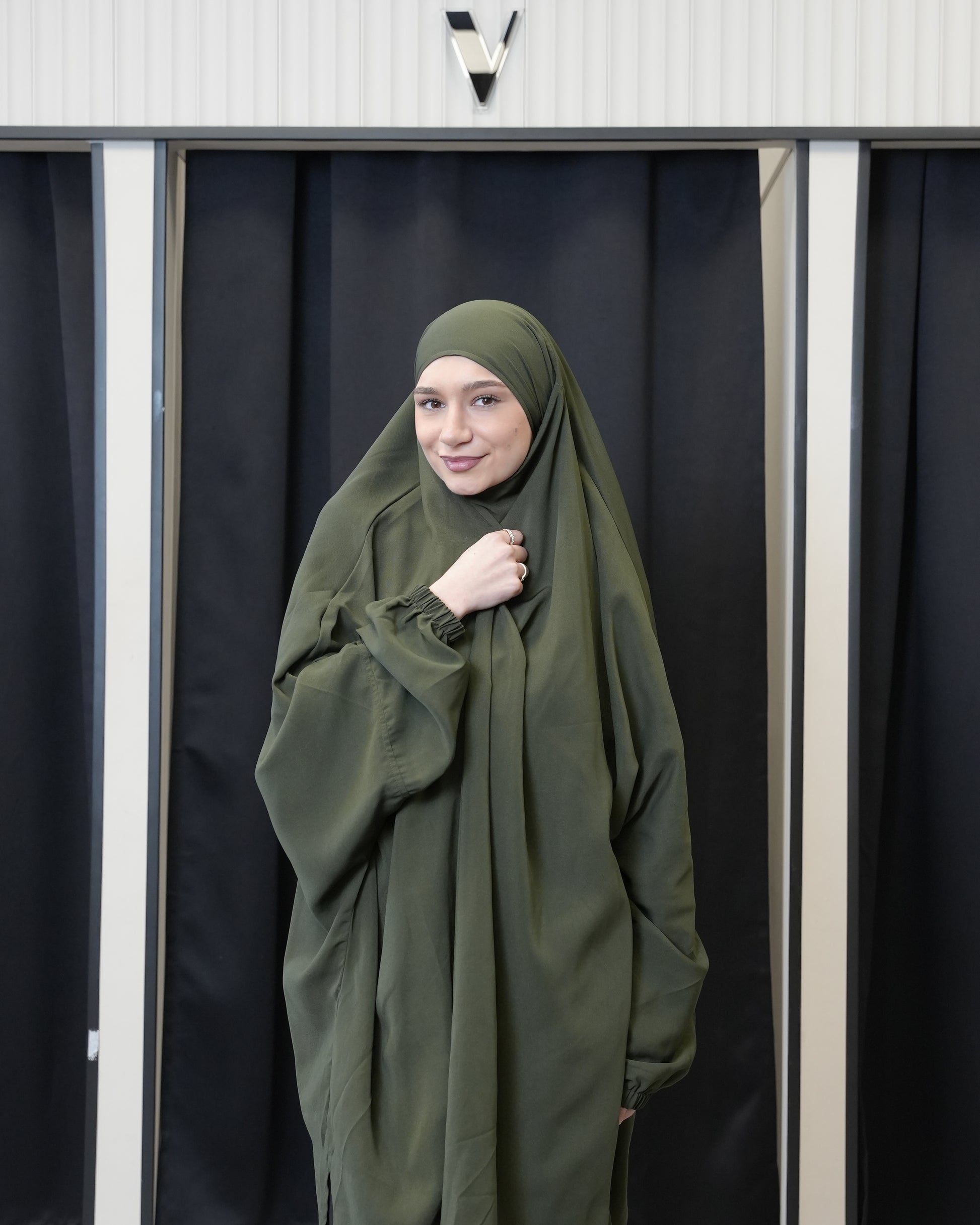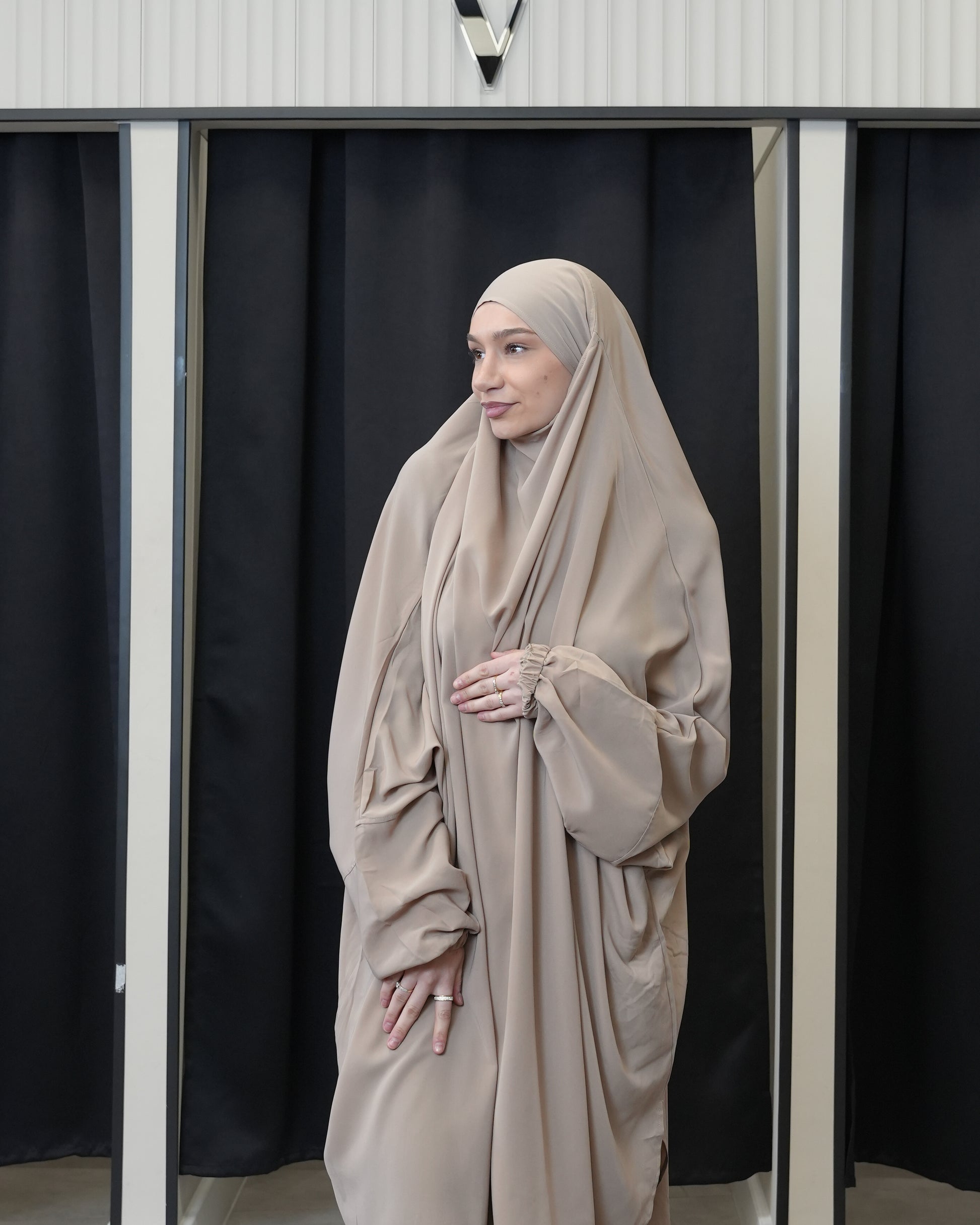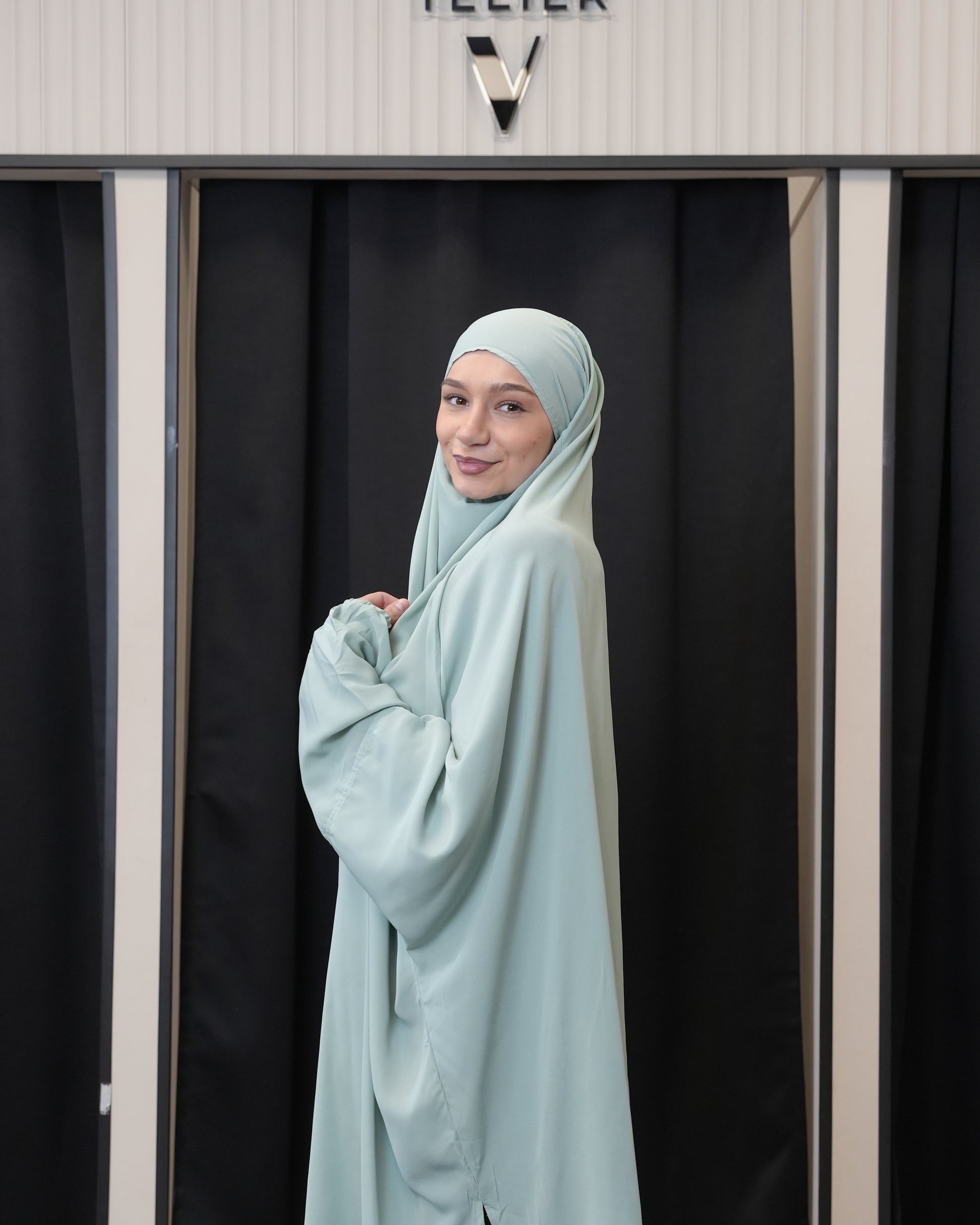 Der Zweiteiler ist perfekt für regnerische Tage oder den Schneefall geeignet, da ein nasser Bund, der am Boden schleift, vermieden wird. Trotz seiner Leichtigkeit ist der Jilbab vollständig Blickdicht.